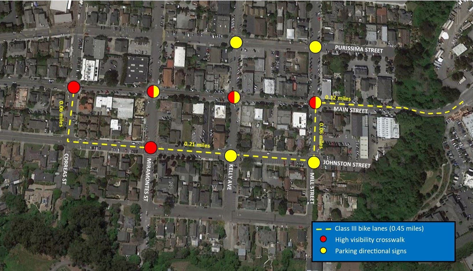 Bicycle Routes: Approximately 0.32 miles of Class II and 0.45 miles of Class III bicycle routes are included in this project to connect HWY 1 to the Main Street Bridge to Correas Street via Johnston Street. This effort will also include the restriping of select parking spaces from 90 degree to a slanted angle.